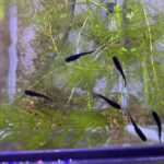 繁殖前オスメス分離後、水温28℃で産卵刷り込み。針子は1Lに50匹、微生物(インフゾリア)で成長促進。半日陰(すだれ使用)で選別、30℃前後維持。