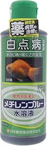 メチレンブルー(0.1%溶液を1-2ml/10L添加)は白点虫の呼吸を阻害します。塩浴と併用で相乗効果があり、2日で症状軽減が見られます。青水に染まるので、治療終了後に水換えを。過剰添加はメダカの体色を青く変えるので注意です。