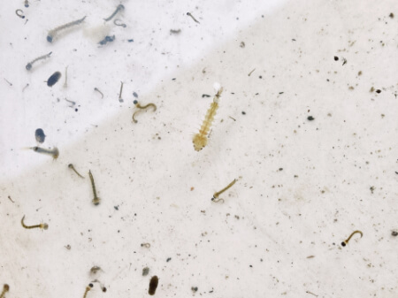 ボウフラとは蚊の幼虫の総称で、アカイエカ・ヒトスジシマカ・チカイエカなど多くの蚊の種が水中でこの形態をとります。蚊が水面に産卵し、孵化した幼虫がボウフラとなります。ボウフラは水面近くを呼吸管(尾端)で大気中の酸素を取り込みながら生活し、腐敗した有機物・藻類・バクテリアを濾し取って成長します。水温25℃前後の環境では孵化からわずか7〜10日前後でサナギ(オニボウフラ)になり、さらに数日で成虫の蚊になります。